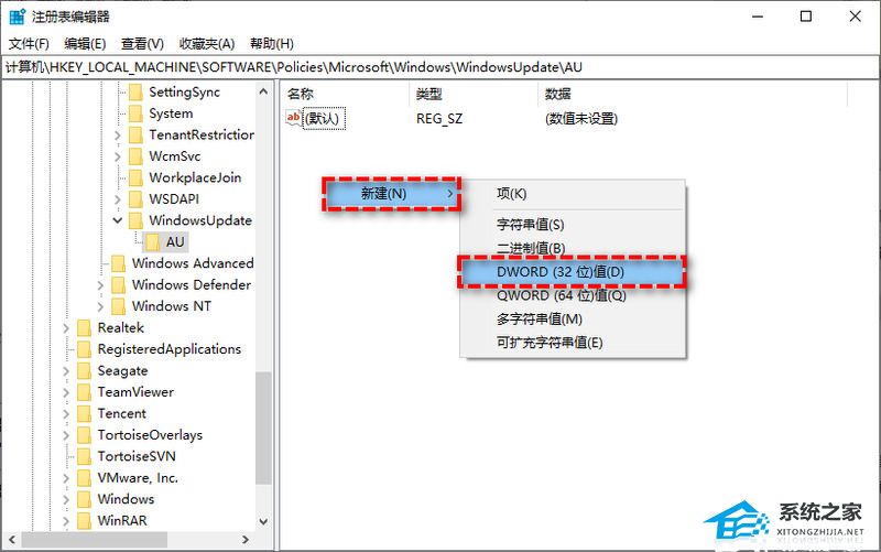 5、在新建的AU文件夹右侧空白页面中右键单击并选择“新建”>“DWORD(32位)值”,然后将其命名为“NoAutoUpdate”。