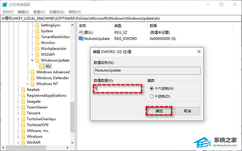 6、双击新建的NoAutoUpdate,在弹出窗口中将其数值数据从0更改为1,然后单击“确定”。