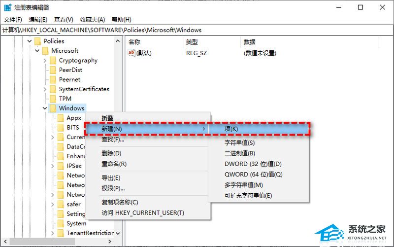 3、右键单击Windows文件夹,选择“新建”>“项”,然后将其命名为“WindowsUpdate”。