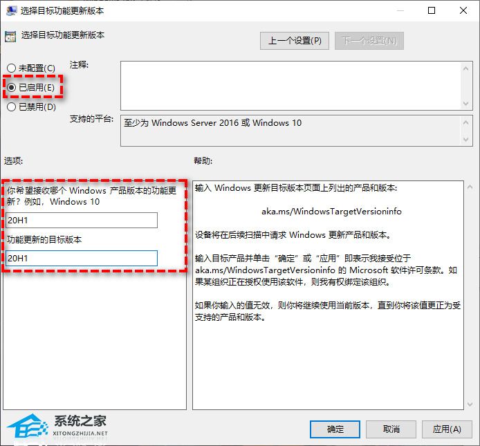 4、在弹出窗口中将其配置为“已启用”,在左下方长条框中填入“20H1”(或者其他您想停留的Windows10版本),然后单击“应用”>“确定”即可。