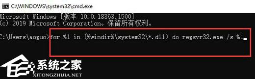 4、在其中输入“for %1 in (%windir%system32*.dll) do regsvr32.exe /s %1”回车确定,用来重新注册所有的dll文件。