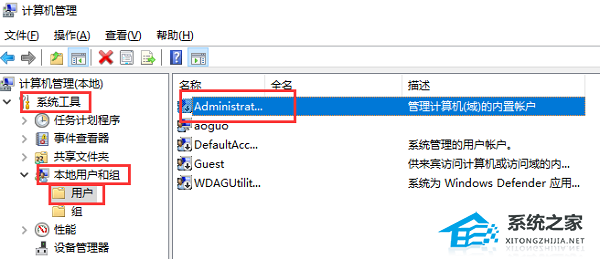 2、展开至计算机管理——系统工具——本地用户和组——用户,在右侧找到并打开Administrator。