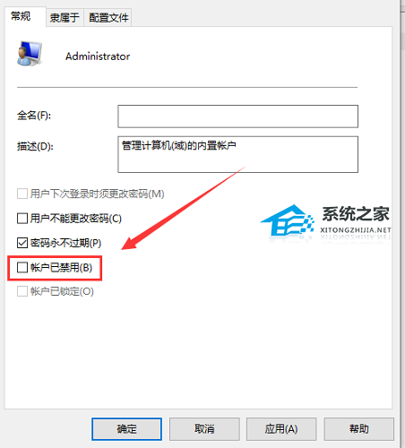 3、在Administrator属性界面中,取消勾选“帐户已禁用”,点击确定即可。
