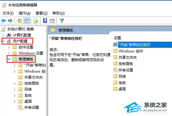3、在打开的本地组策略编辑器,依次点击“用户配置→管理目标→开始菜单和任务栏”。