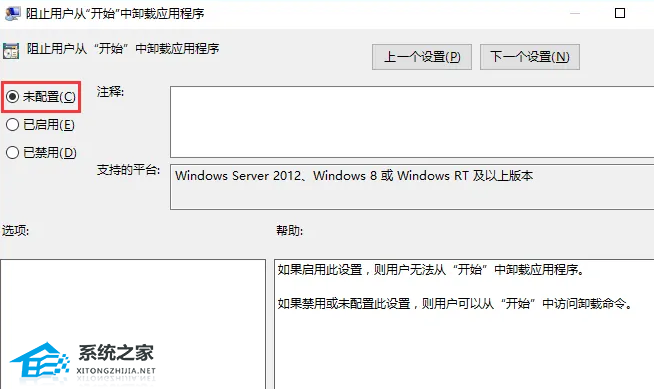 5、在打开的属性窗口中,选择“未配置”,然后点击确定。