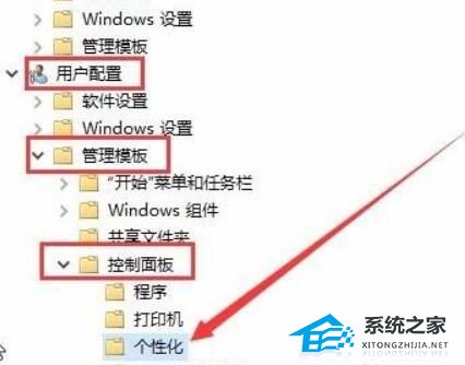 3、然后依次进入其中的“用户配置-管理模板-控制面板-个性化”。