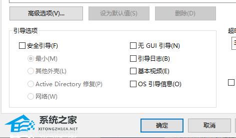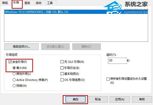 2、然后切换到“引导”界面。将“安全引导和最小”进行勾选,点击确定。