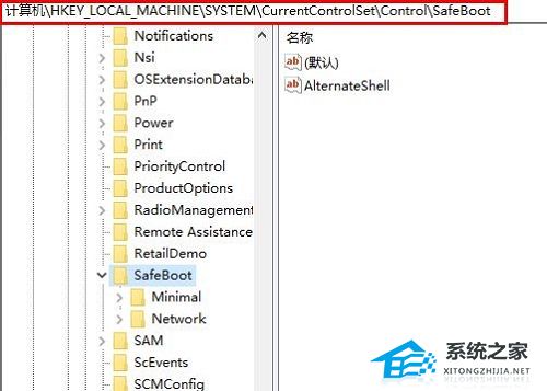 5、然后依次展开文件夹:HKEY_LOCAL_MACHINESYSTEMCurrentControlSetControlSafeBoot。