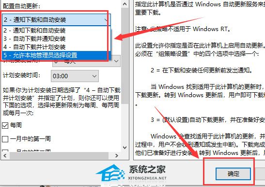 5、这时下面的选项会呈可选状态,我们可以设置、通知下载并通知安装、自动下载并通知安装、自动下载并计划安装、允许本地管理员选择设置。