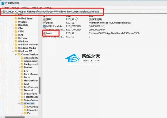 2、打开注册表编辑器后进入这个目录HKEY_CURRENT_USERSoftwareMicrosoftWindows NTCurrentVersionWindows