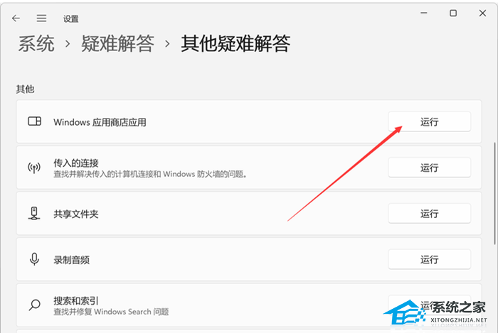 2、其他疑难解答页面,点击其他下的Windows 应用商店应用后面的【运行】。运行后,系统就会尝试查找修复问题。