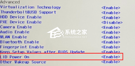 2. 在BIOS设置界面,通过键盘上的方向键往下翻,在 Advanced (高级设置)中找到 LID Power On(开盖开机),按 Enter 键确认。