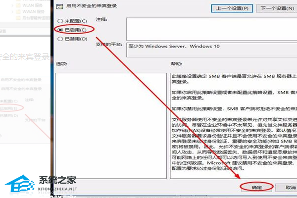 7、然后在界面内找到“已启用”选项并使用鼠标单击勾选即可解决电脑出现“你不能访问此共享文件夹,因为你组织的安全策略阻止未经身份验证的来宾访问。”的问题了。