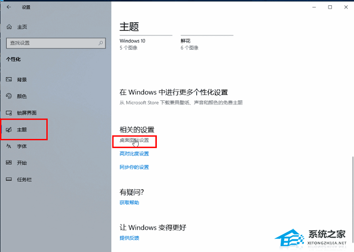 2、在新界面中,点击左侧菜单栏中的“主题”选项,然后点击右侧“相关设置”下方的“桌面图标设置”。