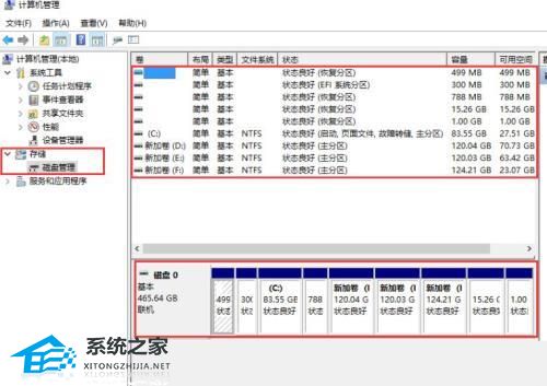 2、弹出计算机管理窗口后,可以在左侧看到有“磁盘管理”标签,点击磁盘管理标签后,在其右侧就会显示电脑磁盘各个分区分卷信息(如图所示)。