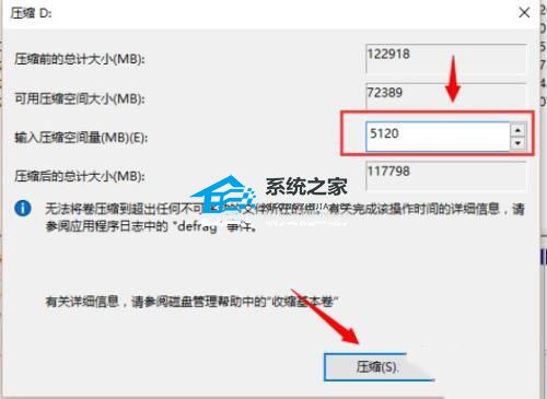 3、之后就可以选择一个空闲空间比较大的磁盘进行压缩了,比如希望把D盘的一些磁盘空间调整到C盘,那么我们可以选种D盘卷,再其上点击鼠标右键,在弹出的菜单中选择“压缩卷”然后在输入压缩空间量(MB)里填写要压缩出的空间量,如果要压缩出5G,就填写5GX1024MB=5120M,那么我们填写上5120即可(如图所示)。