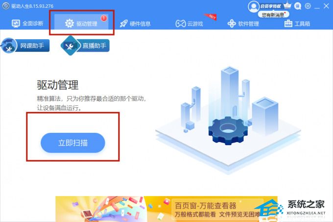 2、在【驱动管理】处点击【立即扫描】,“驱动人生8”将对你的电脑进行扫描检测,显示出驱动正常或异常的状态。