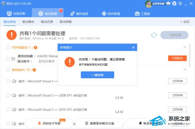 3、点击设备旁边的【升级驱动】,或直接点击【一键修复】,软件会自动为你更新系统上所有缺失或过时的驱动程序,安装正确版本。