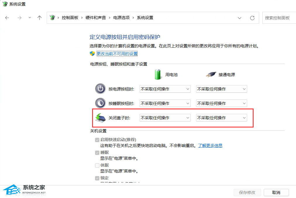 4、最后 修改关闭盖子时应该执行的操作后点击保存就OK了。