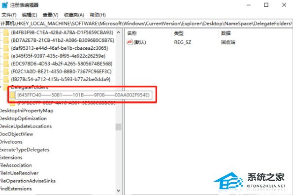6、新建“项”完成后点击新建项会出现以下界面,将新出现“项”的名字重新命名为{645FFO40——5081——101B——9F08——00AA002F954E}。