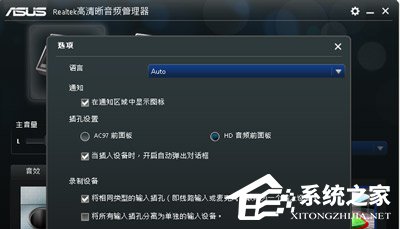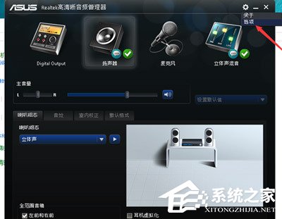 4、在Realtek高清晰音频管理器界面中,点击设置图标,弹出菜单栏,我们选择“选项”: