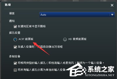 6、将插孔设置单选框选择AC97前面板,并确定: