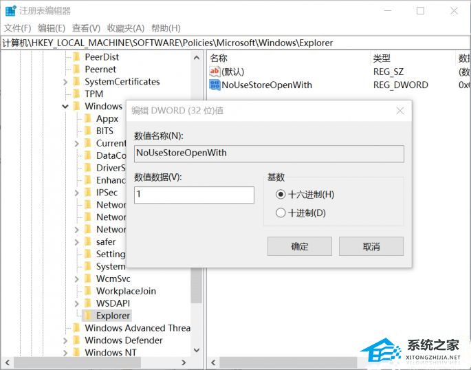 3、随后在其右侧新建个名为“NoUseStoreOpenWith”的DWORD(32位)值,把数值数据设置成“1”就可以收工了。