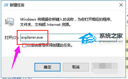 3、打开一栏中输入Explorer.exe,并按下回车,之后屏幕就可以正常显示了。