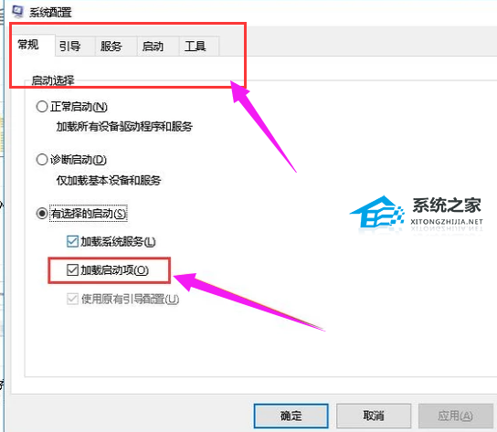 5、然后进入系统配置界面,将“加载启动项”一栏取消勾选。