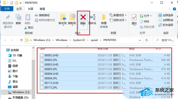 3. 这时候,再打开运行(Win+R),输入【C:WindowsSystem32spoolPRINTERS】,按【确定或回车】;
