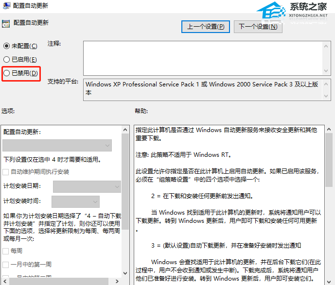 2. 双击打开配置自动更新,然后选择已禁用,点击确定。
