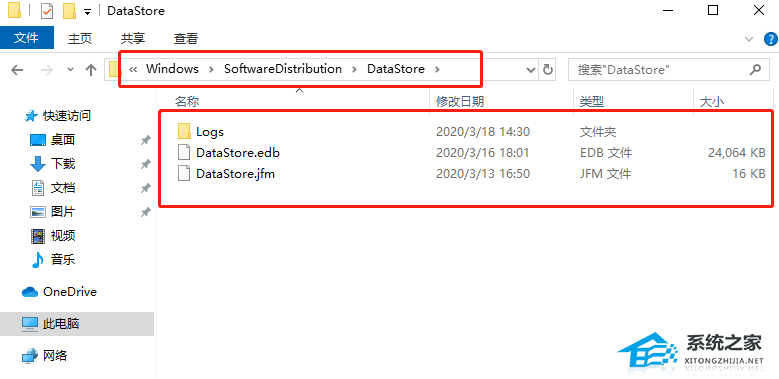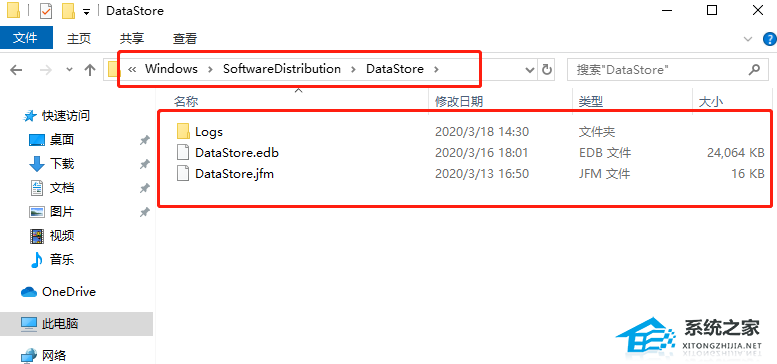 2. 在C盘中,依次打开到:Windows>SoftwareDistribution,删除DataStore里面所有文件(更新失败的补丁文件)。