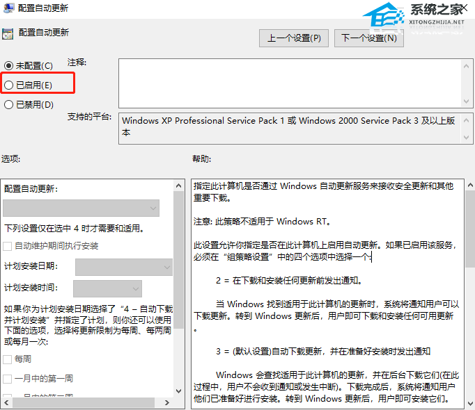4. 配置自动更新窗口中,再重新选择已启用。
