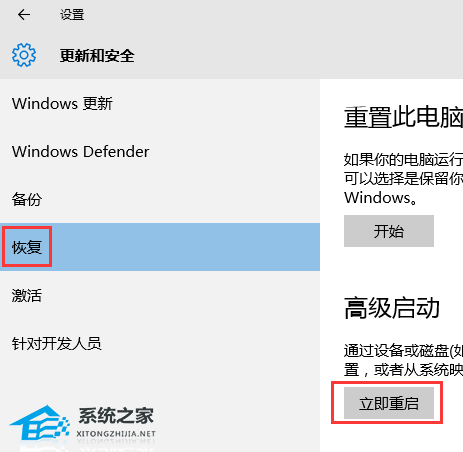 3. 在“更新和恢复”界面下点击“恢复”,然后在高级启动下面点击“立即重启”。