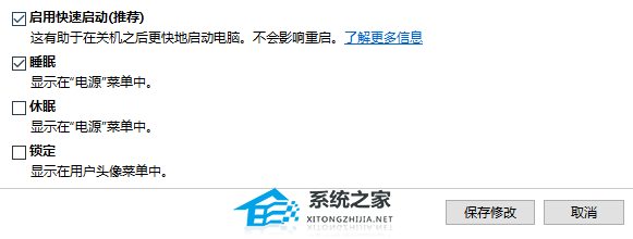 9. 将此选项“启动快速启动”取消勾选,然后点击下方的“保存修改”。