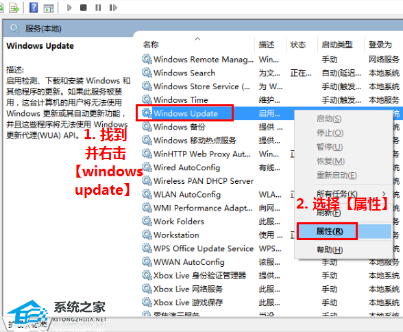 2. 在打开的“服务”窗口中,找到【windows update】,右击选择【属性】。