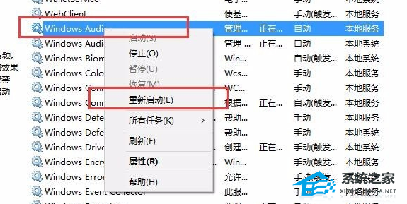 3. 右键单击每个服务,选择“重启”来重新启动服务,检查声音是否恢复。