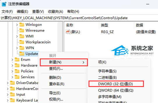 6. 再【右键】点击【Update】,在打开的菜单项中,选择【新建DWORD (32 位)值(D)】;