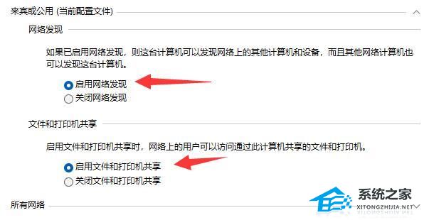 3. 将“网络发现”和“打印机共享”都启用并保存修改。