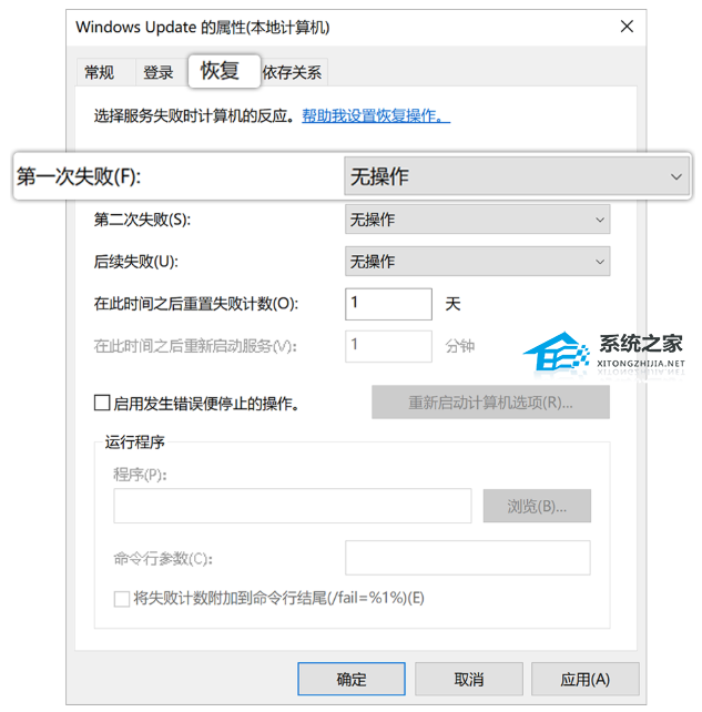 4. 再点击“恢复”,将“第一次失败”时的默认操作改为“无操作”,点击“确定”。下次启动计算机时,将不再启动自动更新。