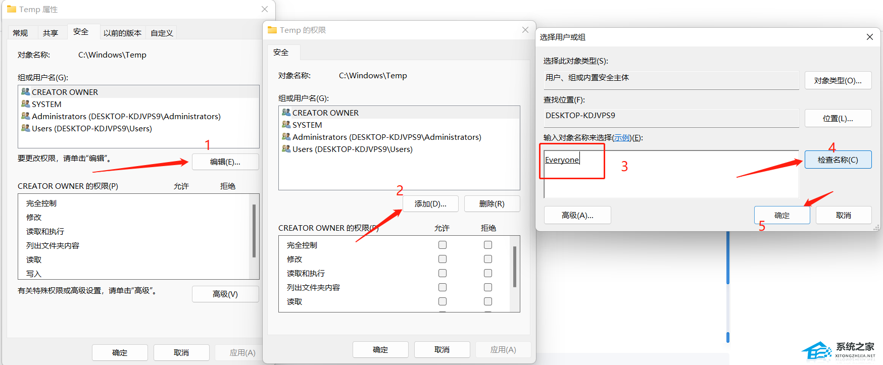 3. 点击编辑,添加,输入everyone后,点击检查名称后,确定。
