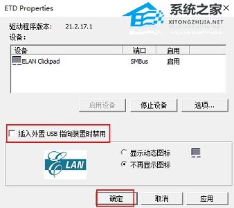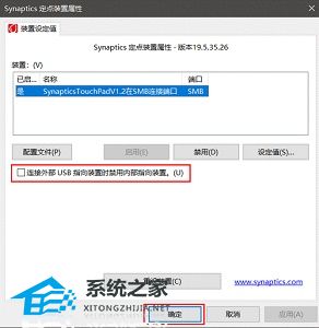2. 勾选“插入外置USB指向装置时禁用”,再点击“确定”。