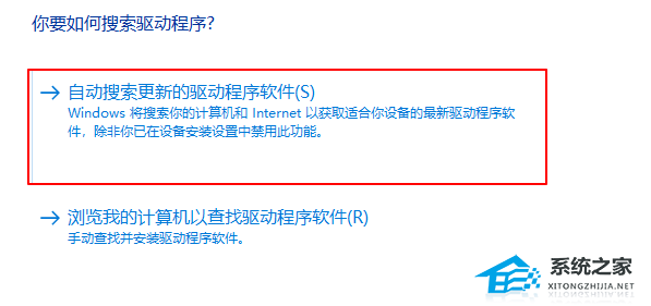 3. 点击第一项“自动搜索更新驱动程序”,接下来系统会自动检测出没有安装的网卡驱动并自动安装上。
