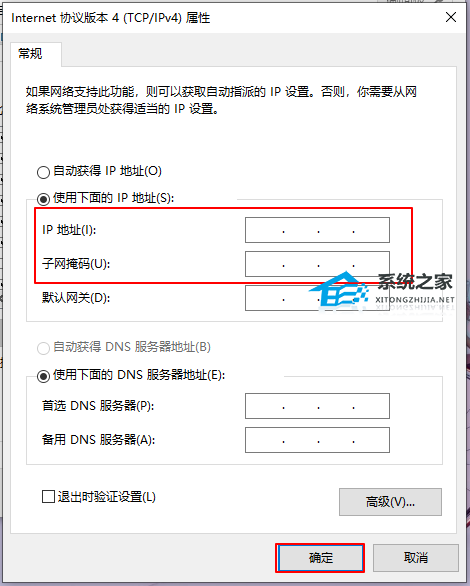6. 在IP地址中填写“192.168.0.1”,在子网掩码中填写“255.255.255.0”,其他不用填写,然后点“确定”即可。