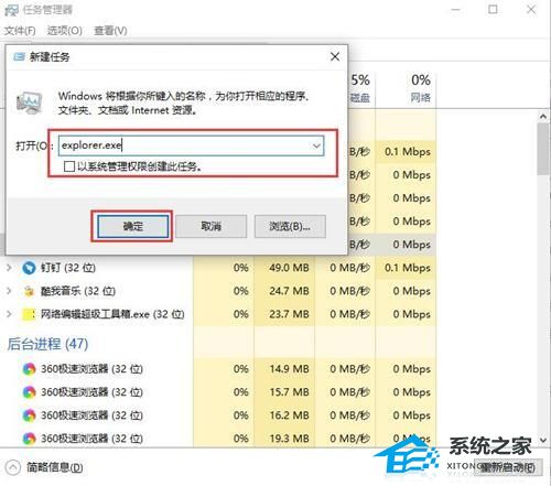 5. 然后再次打开运行,输入【explorer.exe】,重新启动Windows资源管理器就行了。