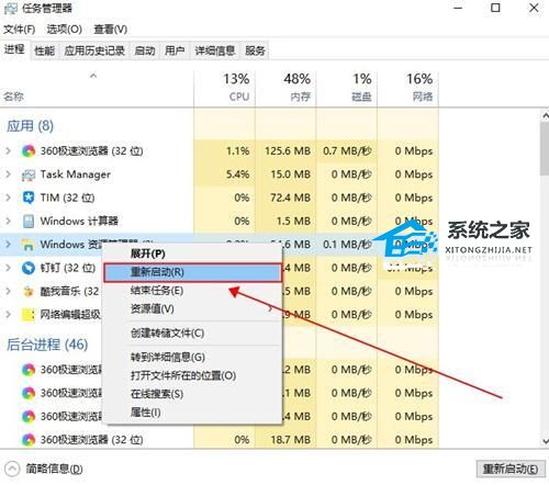 4. 然后打开任务管理器,重新启动【Windows资源管理器】就行了。