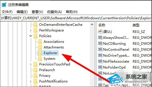 3. 这时会打开注册表编辑器窗口,在窗口中我们定位到计算机HKEY_CURRENT_USERSoftwareMicrosoftWindowsCurrentVersionPoliciesExplorer册表项。