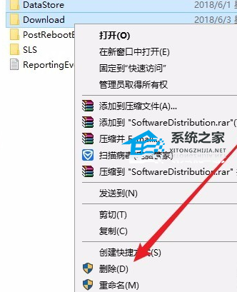 3. 打开文件资源管理器,转到【C:WindowsSoftwareDistribution】,将其中Download和DataStore文件夹内的全部文件删除,注意:删除文件夹内的文件,并不是这两个文件夹。