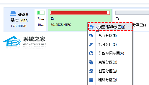 2. 安装完成后打开它,并右键“c盘”选择“调整/移动分区”。