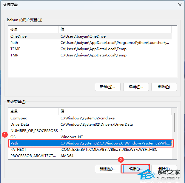 4. 环境变量窗口,系统变量下,选择【Path】,再点击【编辑】;
